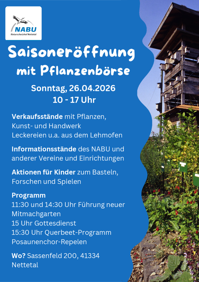 Auch in diesem Jahr begrüßen wir die warme Saison mit unserem Fest zur Saisoneröffnung. Dabei bieten wir auf dem Gelände des Naturschutzhofes wieder ein buntes Programm mit verschiedenen Pflanzen-, Verkaufs- und Informationsständen. Wir freuen uns besonders den unterschiedlichen Naturschutz- und Nachhaltigkeitsprojekten unserer NABU-Gruppen und Kooperationspartner*innen eine Bühne zu bieten. Für Kinder wird es Möglichkeiten geben, sich spielerisch und kreativ auszutoben. Auch das leibliche Wohl kommt nicht zu kurz, unter anderem auch dank der frischen Leckereien aus dem Lehmofen.