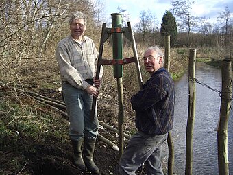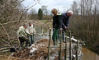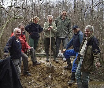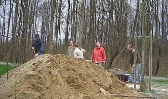 Diese freien Lehmflächen nutzt der Eisvogel, um in die Steilwand eine Nisthöhle zu graben. Die Bruthöhle baut der Eisvogel selbst, sie ist meist ca. 60 bis 80 cm lang und endet in einer etwas größeren Nistmulde. Der Eisvogel ließ es sich nicht nehmen, ein paar Mal in der Nähe der "Baustelle" vorbeizufliegen, als wenn er sagen wollte "Was wird denn hier gebaut?